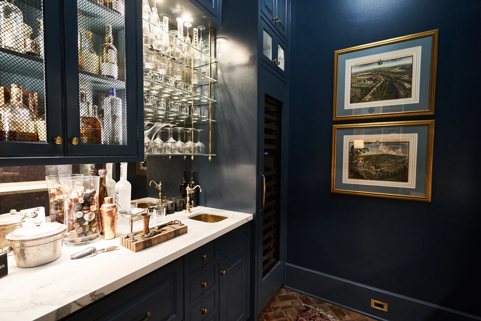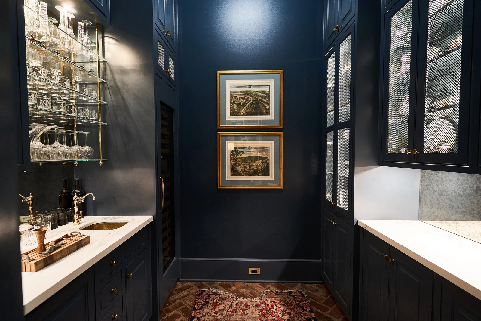 Highlights include a striking butler's pantry with custom cabinetry and brass mesh detailing, a gourmet kitchen with professional-grade appliances and honed stone countertops, and living spaces featuring built-in bookcases, crystal chandeliers, all with carefully executed architectural details that capture the essence of a Creole manor while delivering the benefits of contemporary construction and modern amenities.