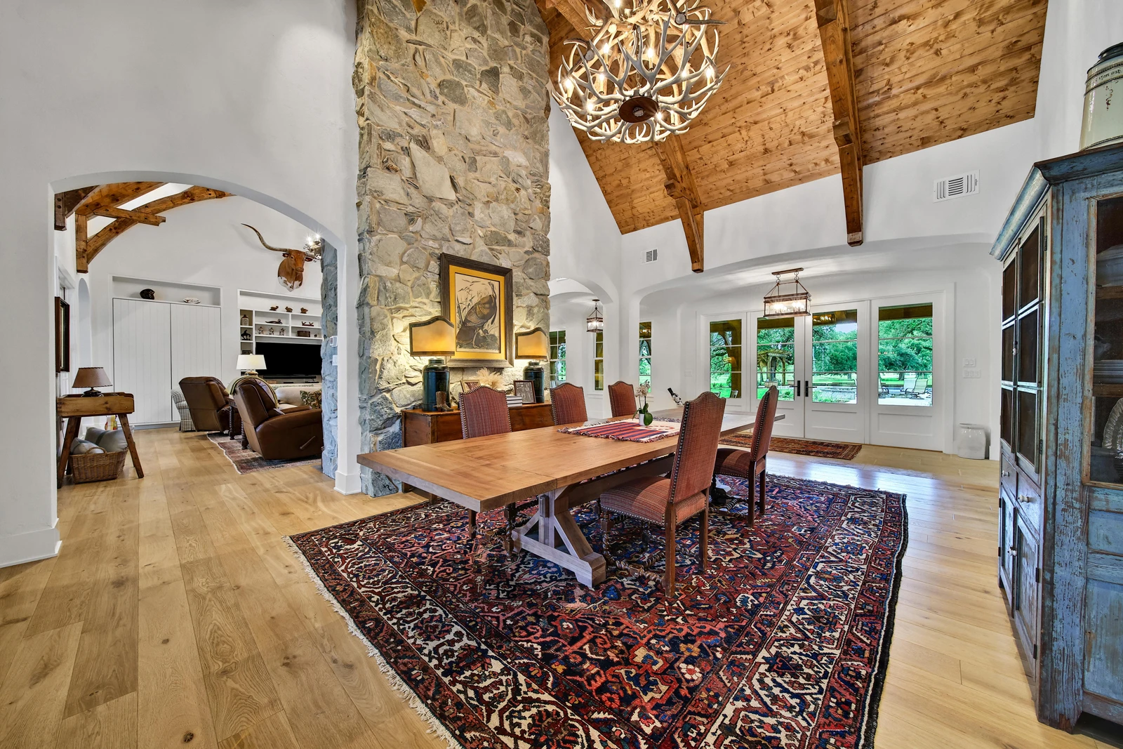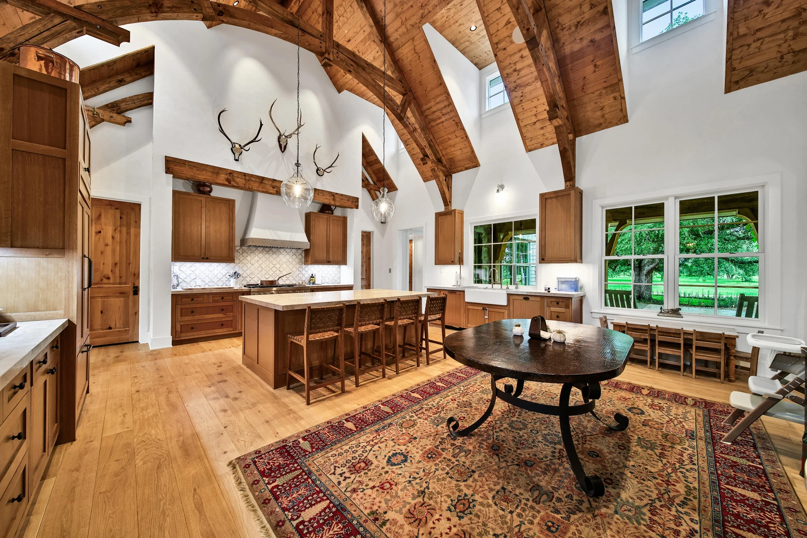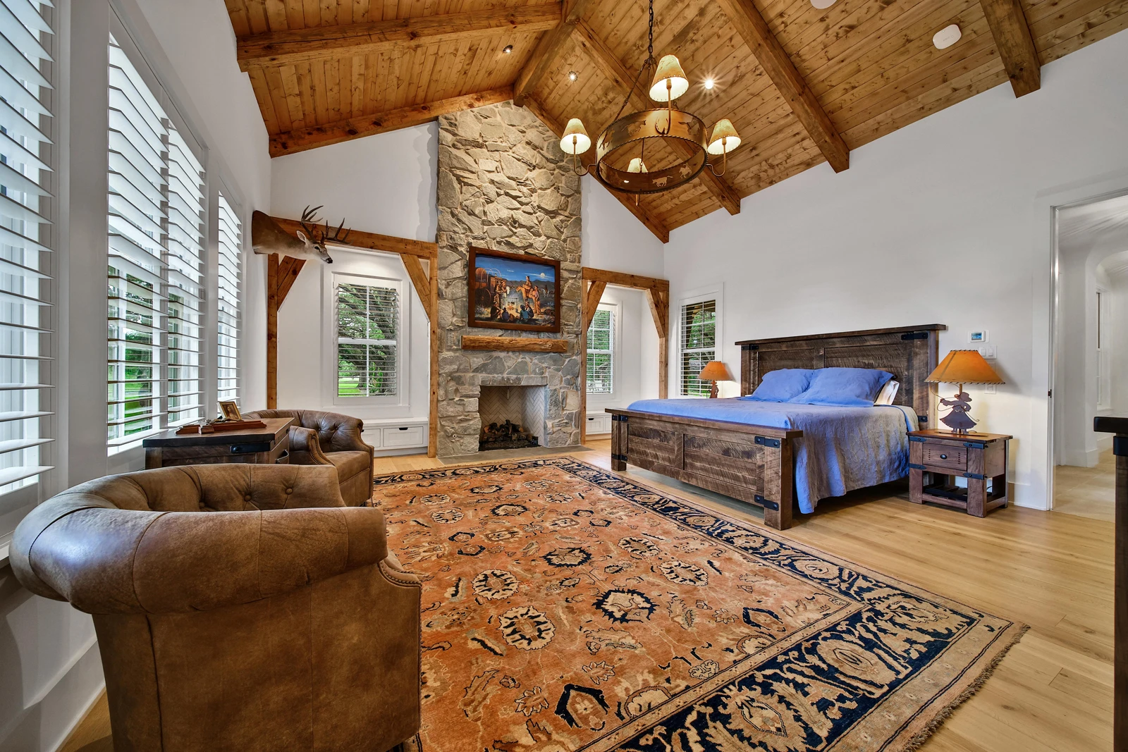 This exceptional new construction country estate showcases rustic elegance through a blend of natural stone and traditional siding exterior with a standing seam metal roof. The home features soaring timber-framed ceilings with exposed wood beams, multiple stone fireplaces and expansive windows. Interior highlights include a gourmet kitchen with rich wood cabinetry and custom millwork, bathrooms with farmhouse-style finishes, and a bunk room perfect for family gatherings.
