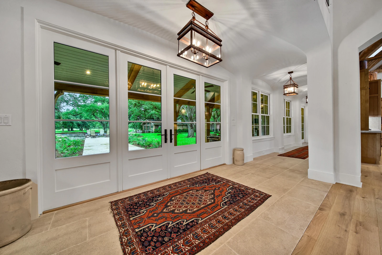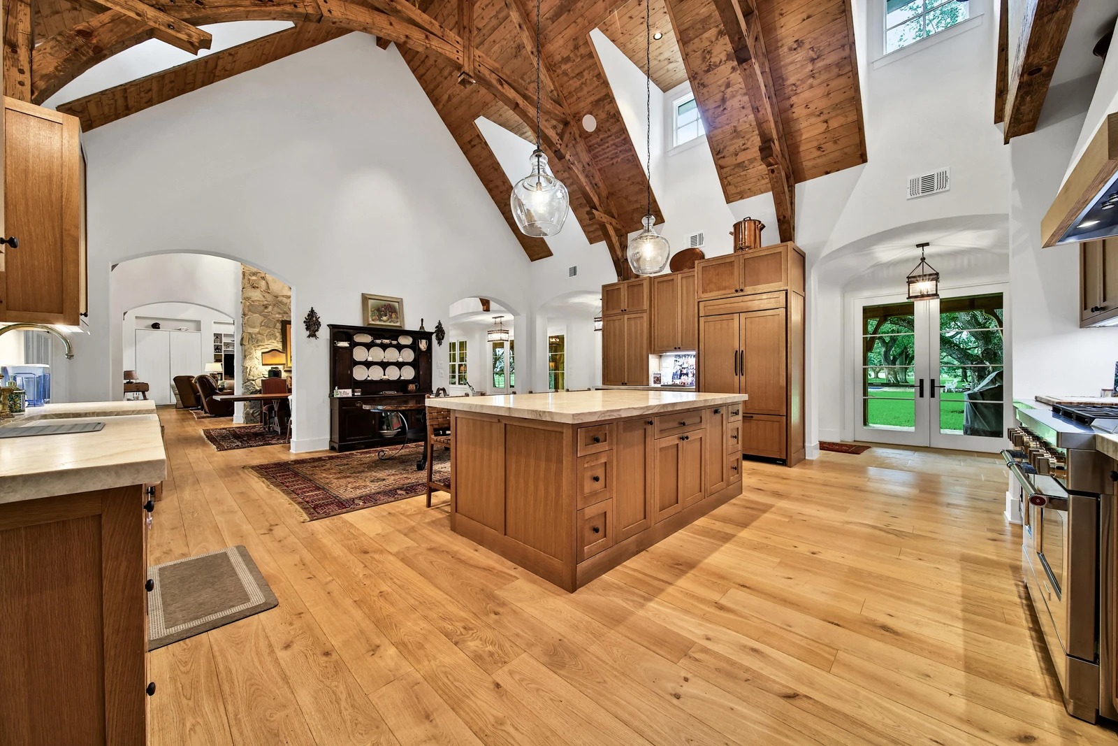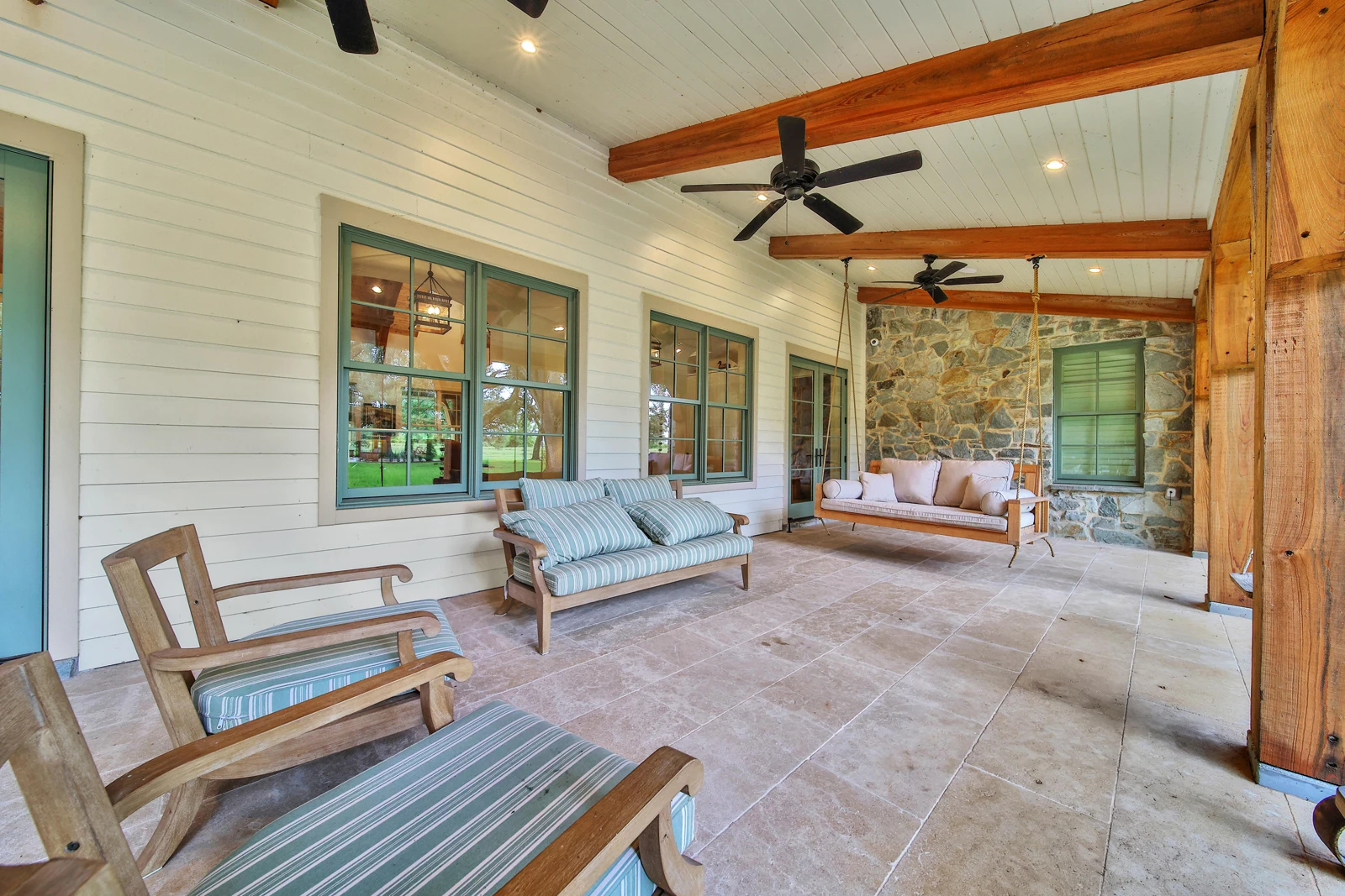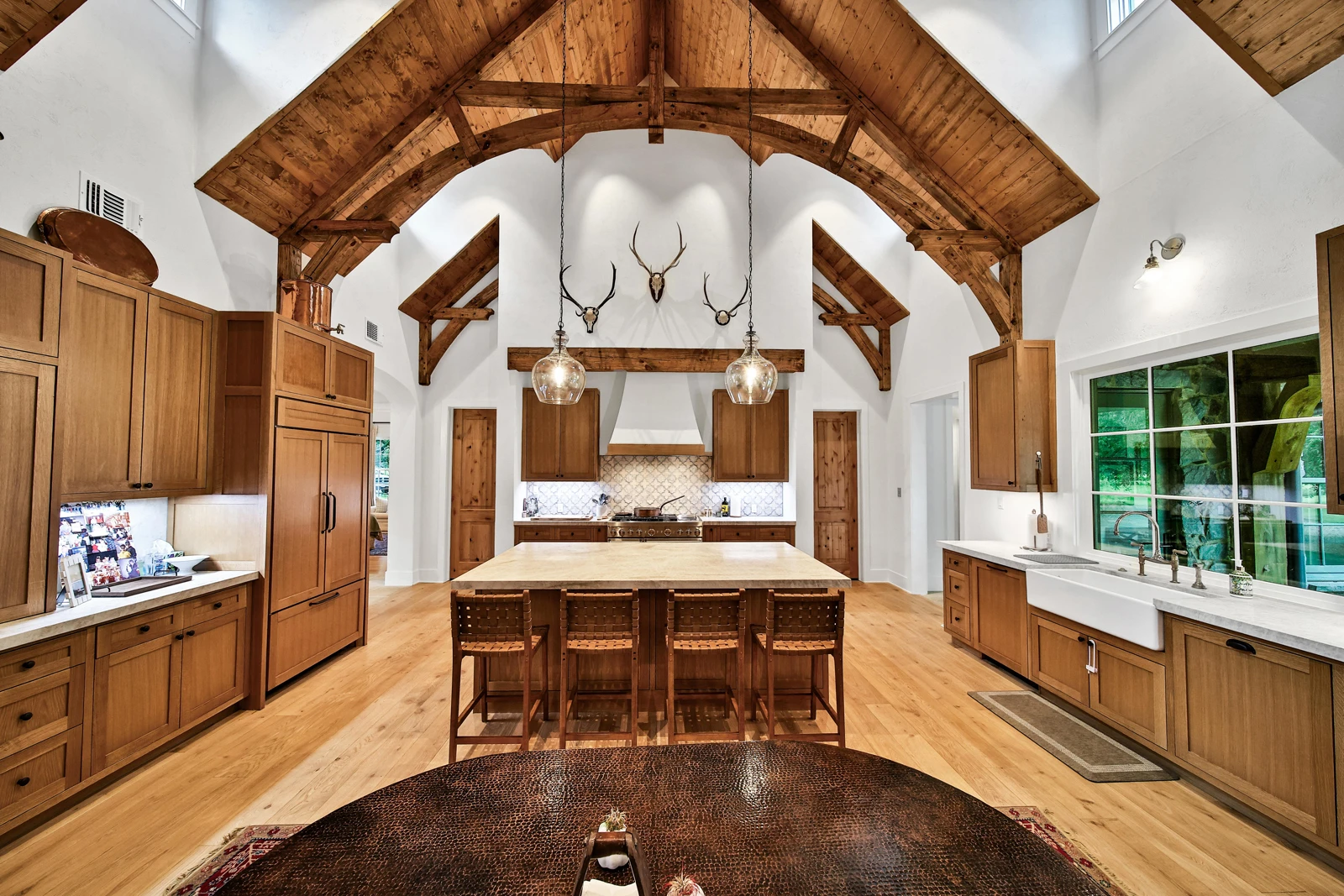 This exceptional new construction country estate showcases rustic elegance through a blend of natural stone and traditional siding exterior with a standing seam metal roof. The home features soaring timber-framed ceilings with exposed wood beams, multiple stone fireplaces and expansive windows. Interior highlights include a gourmet kitchen with rich wood cabinetry and custom millwork, bathrooms with farmhouse-style finishes, and a bunk room perfect for family gatherings.