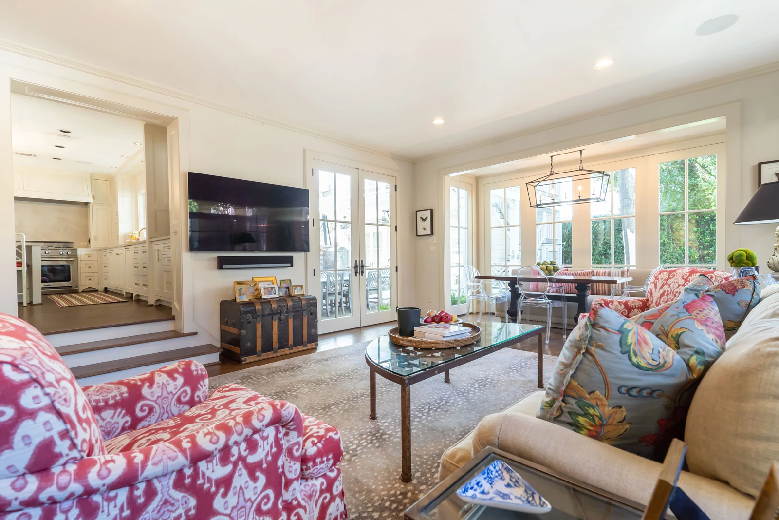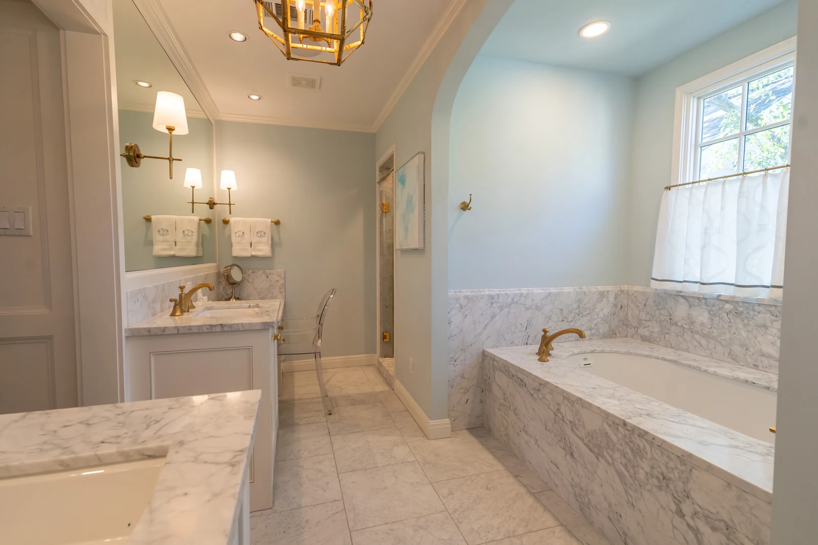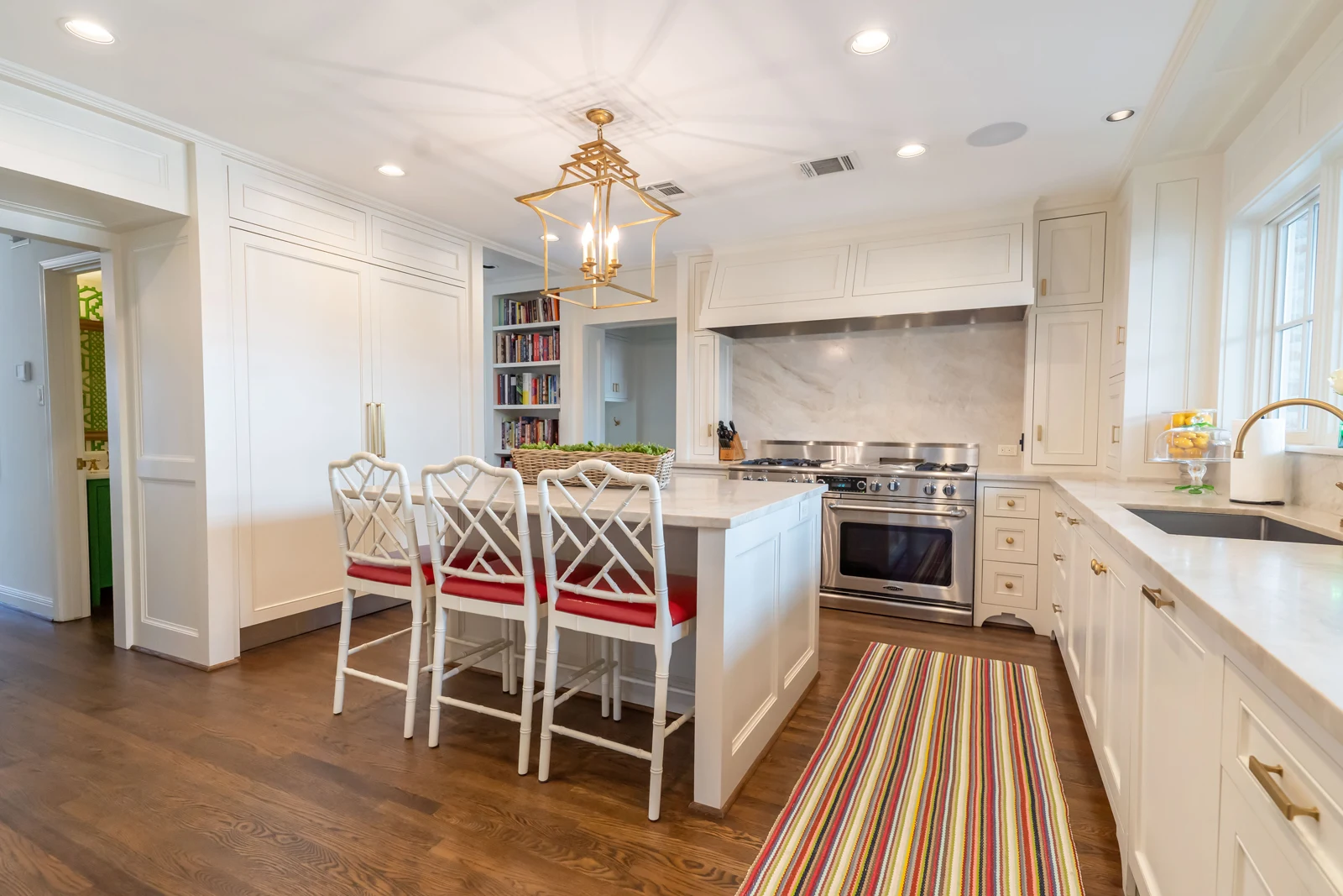 Interior spaces flow seamlessly between the classic white kitchens with brass fixtures and vibrant accent rooms. The master bathroom features blue-gray walls with marble details, while a bold powder room makes a statement with green geometric wallpaper. The open-plan living areas showcase walls of windows that expand the space with views of the outdoors. The outdoor entertaining area extends the living spaces with covered dining and modern landscape design, completing this successful marriage of old and new.