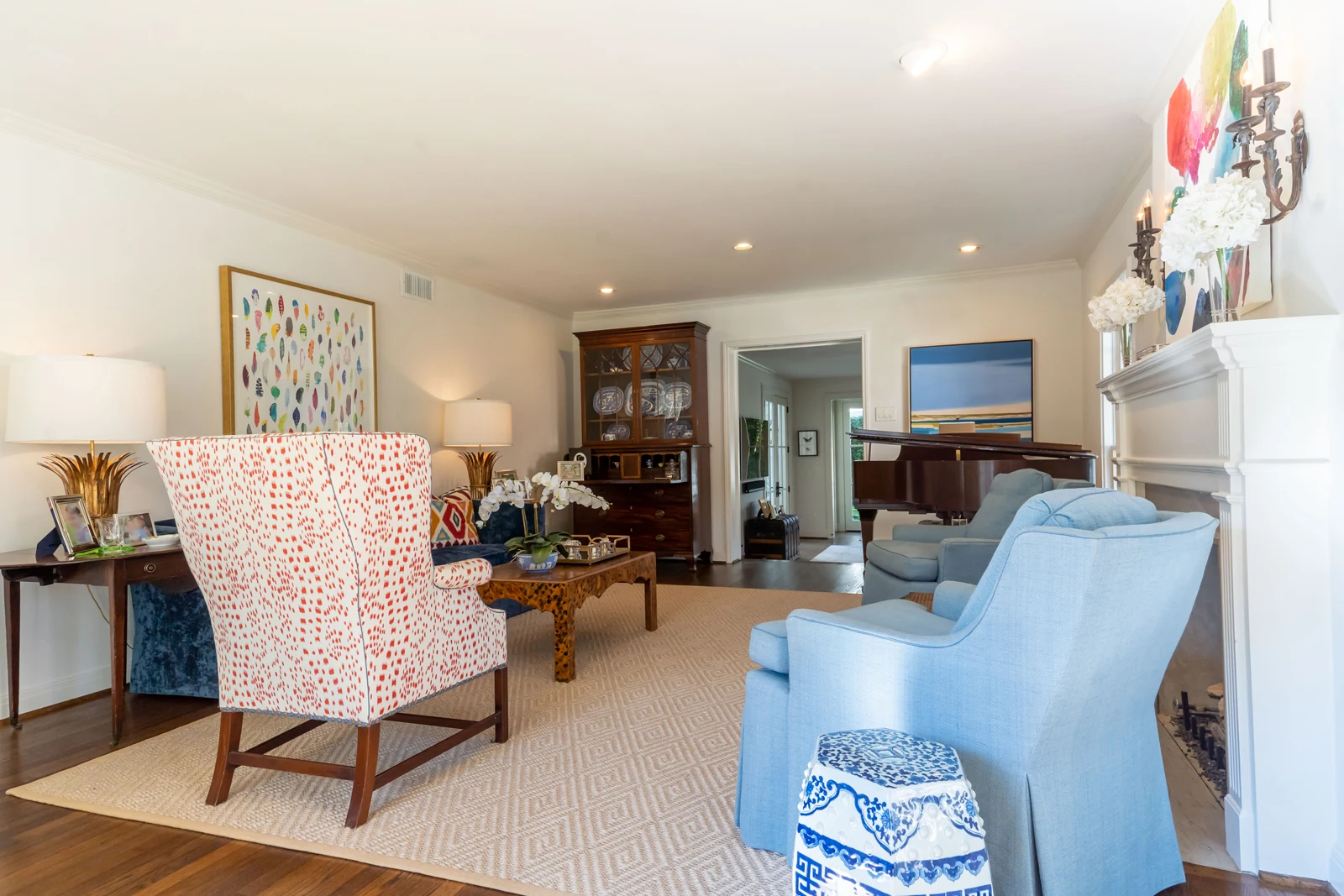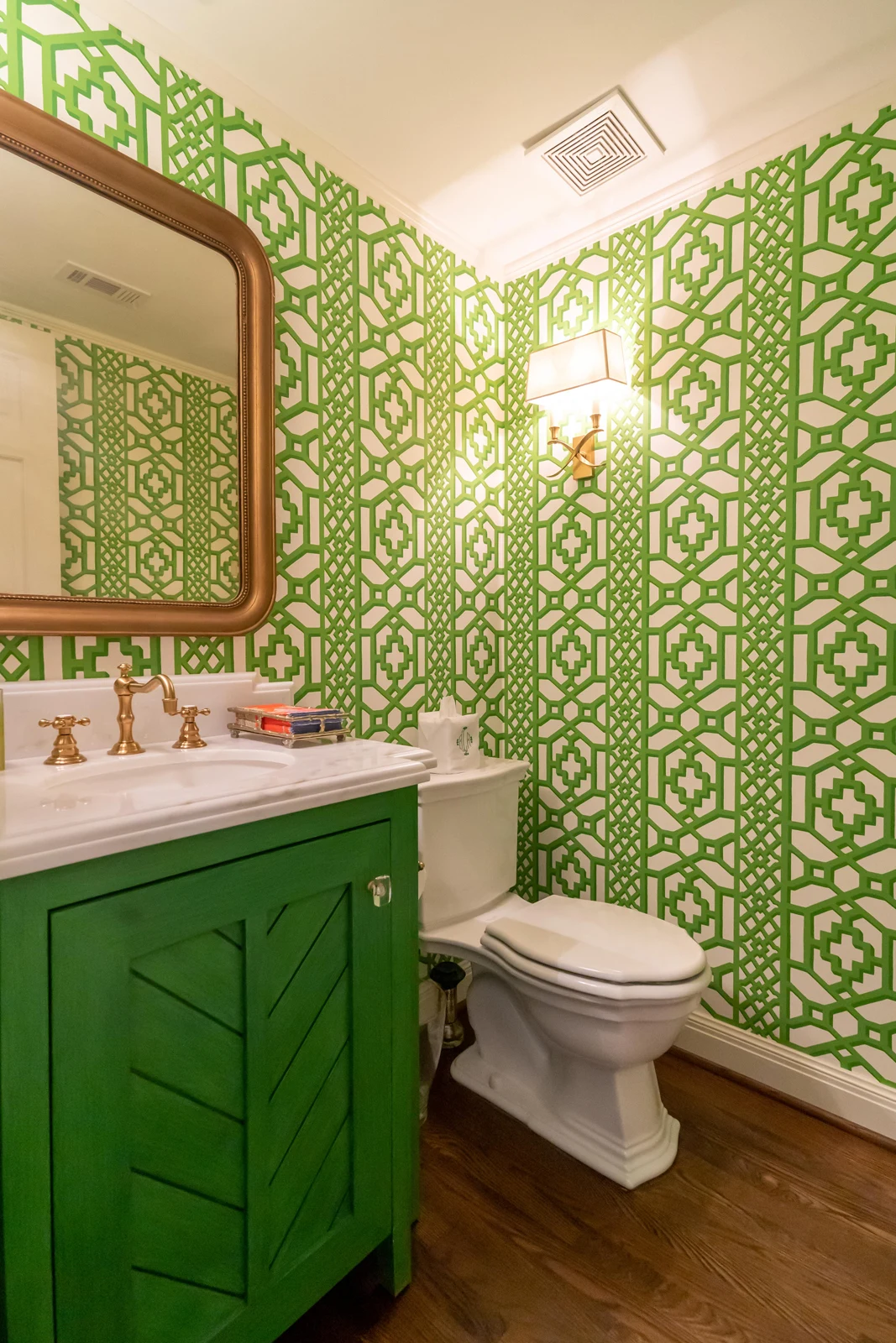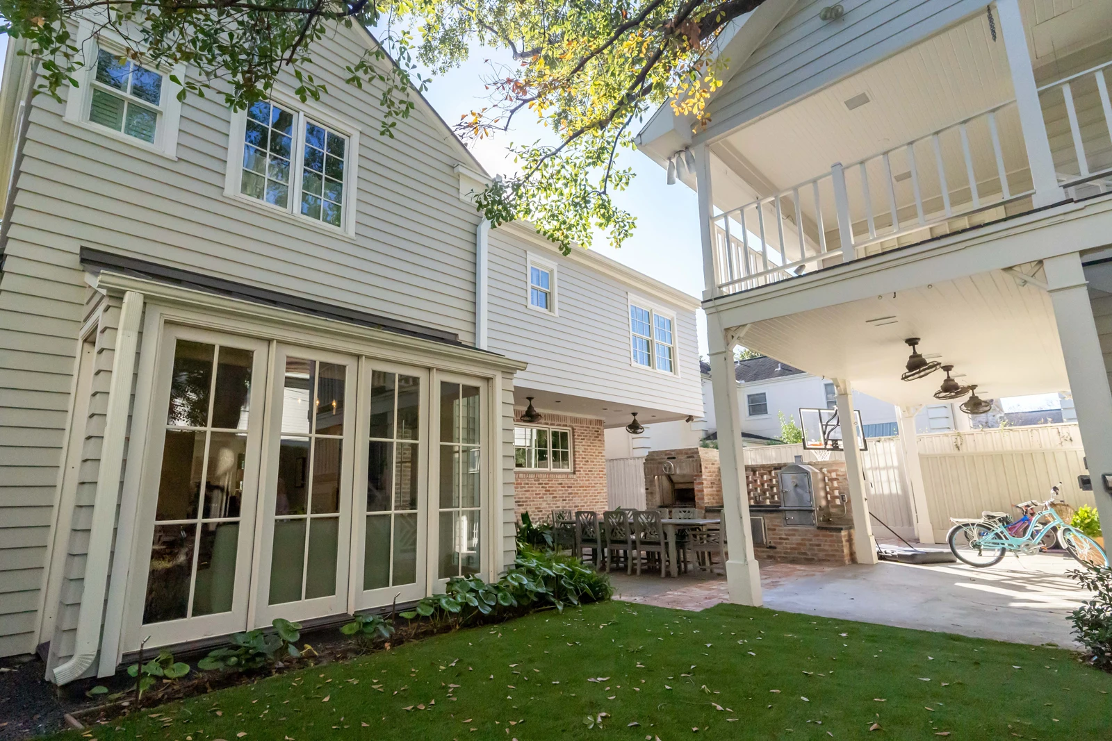 Interior spaces flow seamlessly between the classic white kitchens with brass fixtures and vibrant accent rooms. The master bathroom features blue-gray walls with marble details, while a bold powder room makes a statement with green geometric wallpaper. The open-plan living areas showcase walls of windows that expand the space with views of the outdoors. The outdoor entertaining area extends the living spaces with covered dining and modern landscape design, completing this successful marriage of old and new.