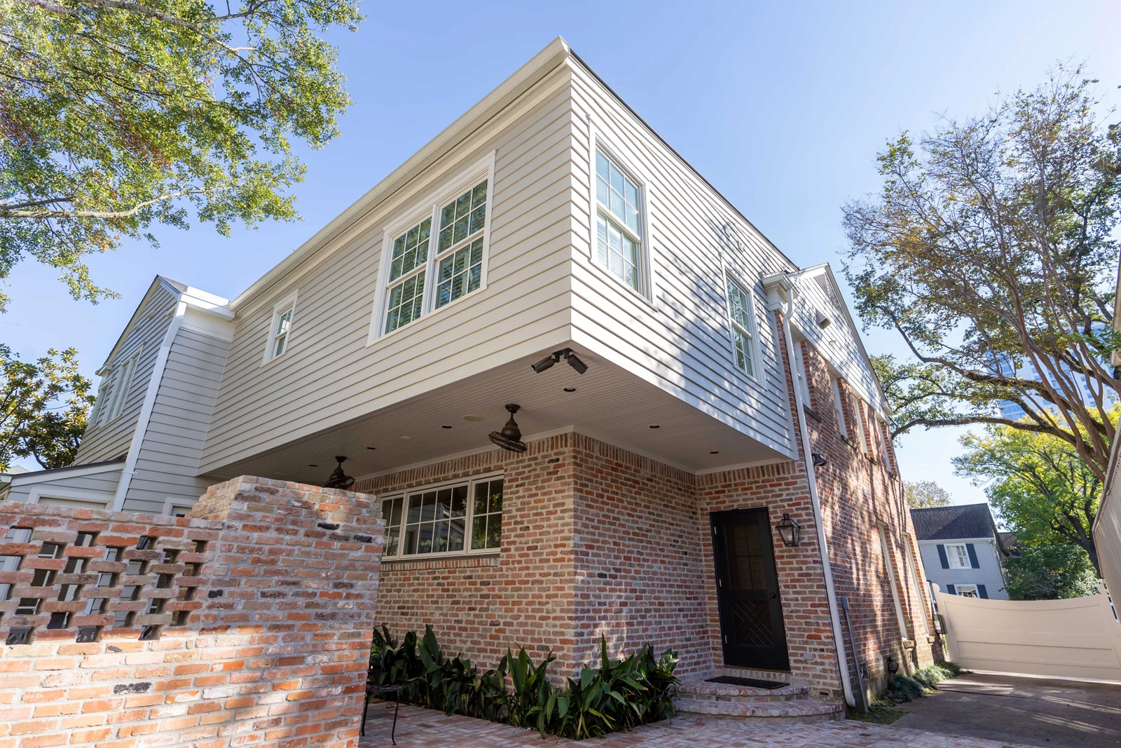 This project showcases a thoughtful blend of traditional and contemporary spaces. The exterior demonstrates an inventive approach to expansion, combining white clapboard siding with exposed brick creating interesting geometric forms. The brick screen walls and varied rooflines add architectural depth while maintaining neighborhood compatibility.