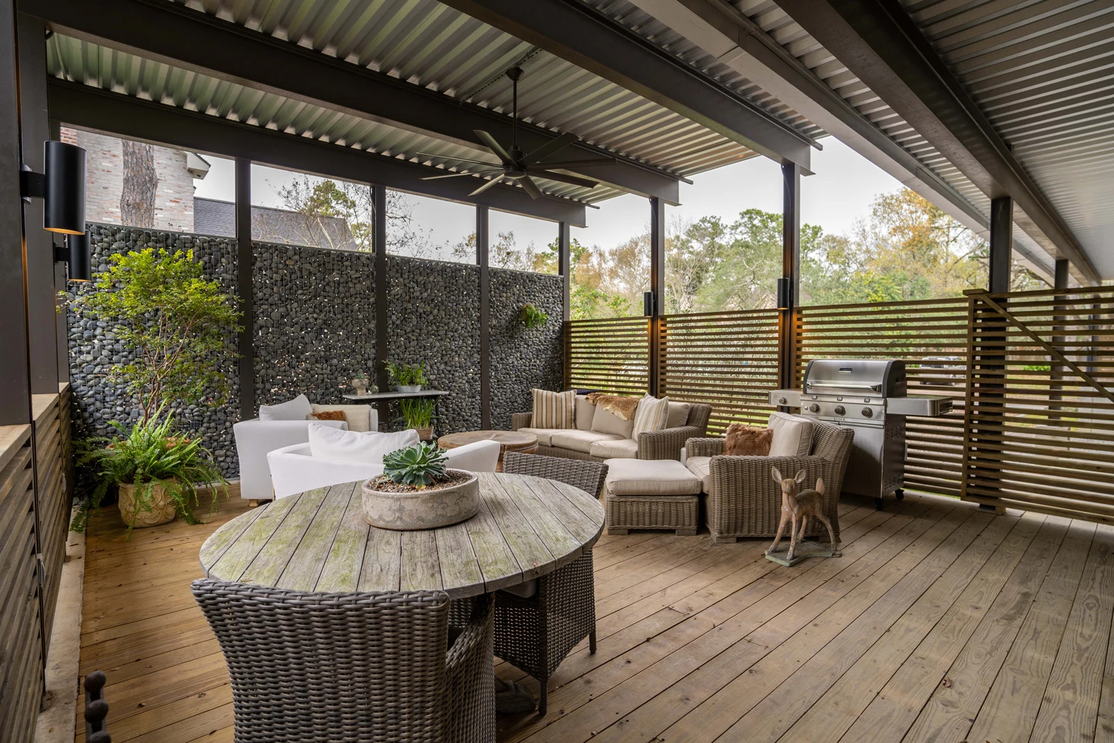 Expansive covered decks with corrugated metal roofing, gabion stone walls, and horizontal wood fencing create multiple outdoor entertaining zones.