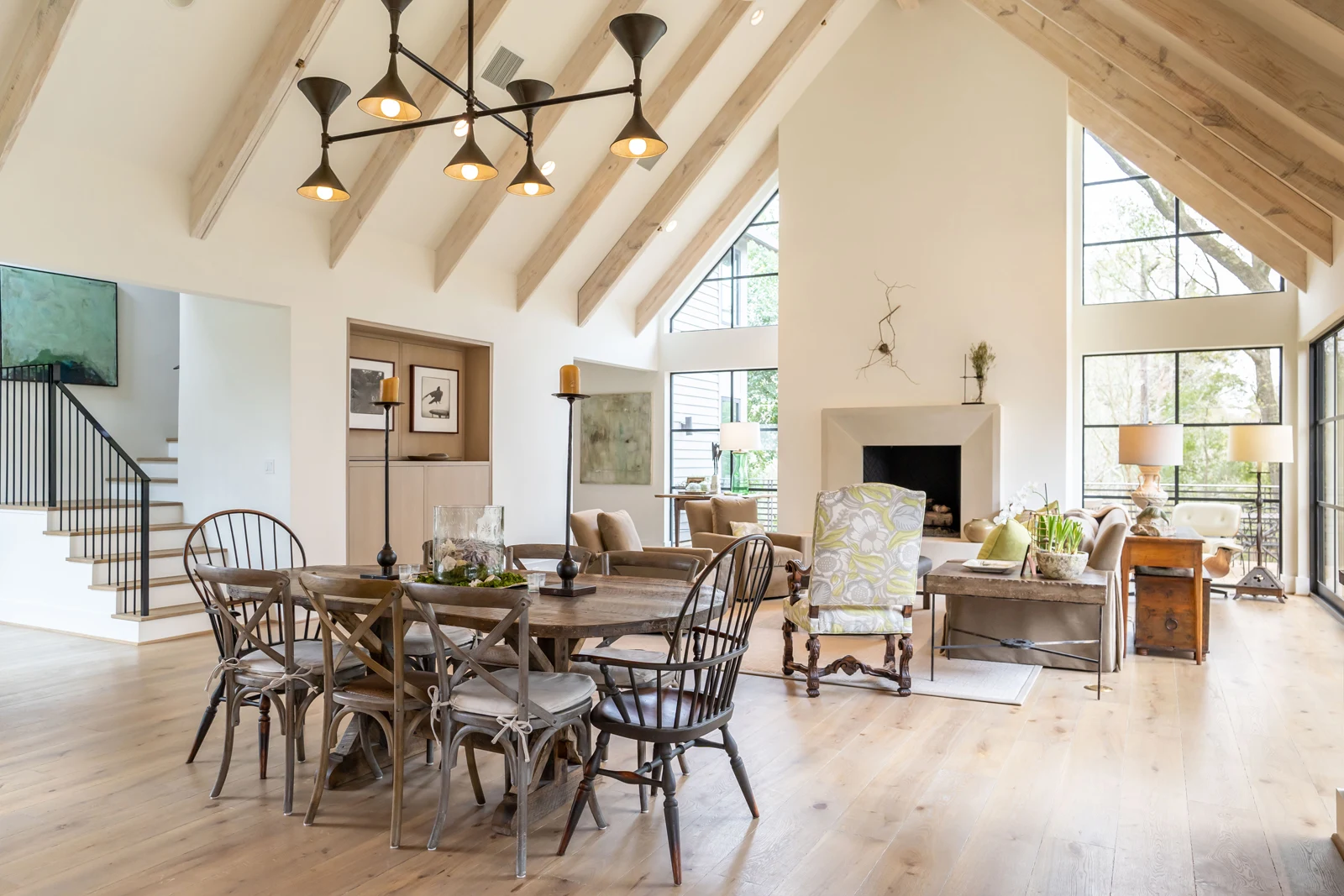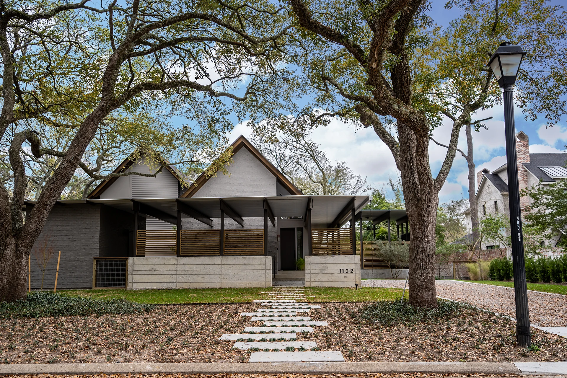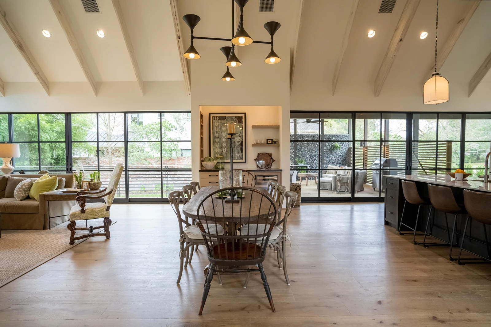 This modern home combines painted brick, horizontal siding, and concrete block with warm wood accents and steel-framed windows for seamless indoor-outdoor living.Interior spaces feature soaring vaulted ceilings with exposed white beams, an open-concept layout with sophisticated kitchen cabinetry, and built-in storage solutions with integrated lighting.
